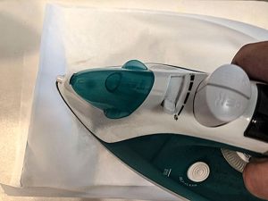 Iron the pattern with a fully-powered iron, securing the mask with breakfast paper.
