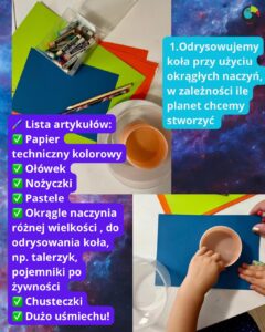 1️⃣ Odrysowywaliśmy planety przy użyciu talerzyków i pokrywek – w ten sposób uzyskaliśmy idealnie okrągłe kształty.