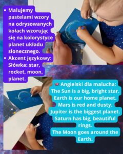 Podczas plastycznych zajęć wprowadziliśmy proste słówka po angielsku o kosmosie. Nauka w ruchu i w kontekście jest najskuteczniejsza!