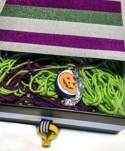 Wykładamy pudełko sznurkami z wełny. U mnie fioletowe i zielone, ale mogą być jakiekolwiek, żeby być zero waste – stare od babci ze strychu.