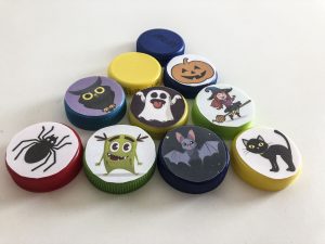 Przygotowujemy nakrętki po jogurtach lub napojach. Drukujemy obrazki i wycinamy. Obrazki można wziąć ze strony freepik.com lub skorzystać z czasopism, wydawnictw, które je udostępniają jak np. „Get Creative!”. Przyklejamy taśmą dwustronną.